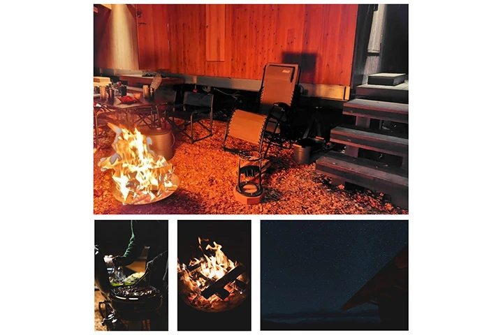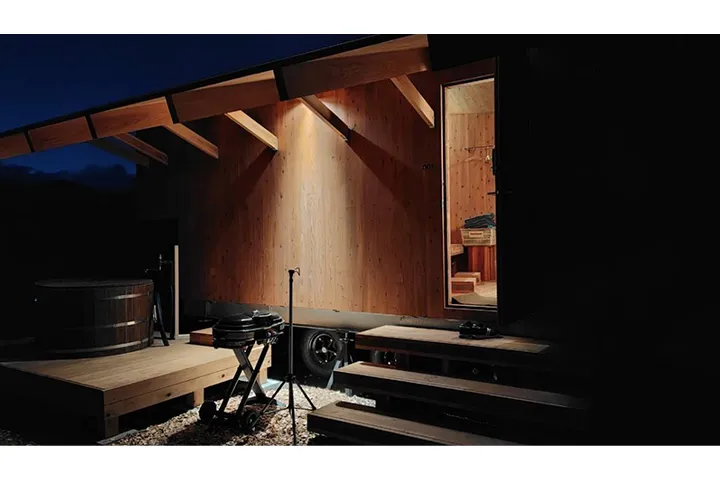 アウトドアのリビングでは、焚き火を囲んだりBBQをしたり。大自然の静寂の中、火を眺めながら過ごす時間は格別で、雑念が取り払われ心底リラックスできます。また、ちょっと寒いなと思ったとき、着衣のままサウナに入り暖を取るのがすこぶる快適。サウナ好きの方にとっても、これは新たな発見になると思います。