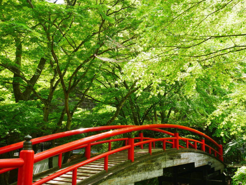 伊香保温泉の最奥部、源泉湧出口と露天風呂に隣接した「河鹿橋」は紅葉の名所としても有名ですが、新緑が美しいスポットでもあります。